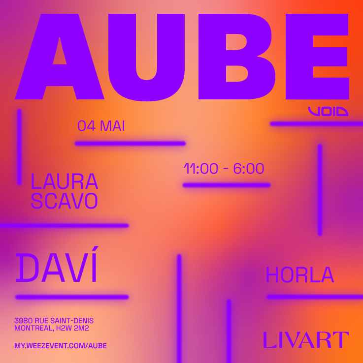 Le Livart vous convie à sa nouvelle soirée dédiée à la musique électronique. AUBE est un événement qui souligne cet amour de la nuit, de la musique et de la danse. Cet événement périodique vous fera découvrir un artiste international, ainsi que deux talents émergents. Récemment dotée d’un système de son VOID, notre salle est prête à vous accueillir pour danser jusqu’aux petites heures du matin.