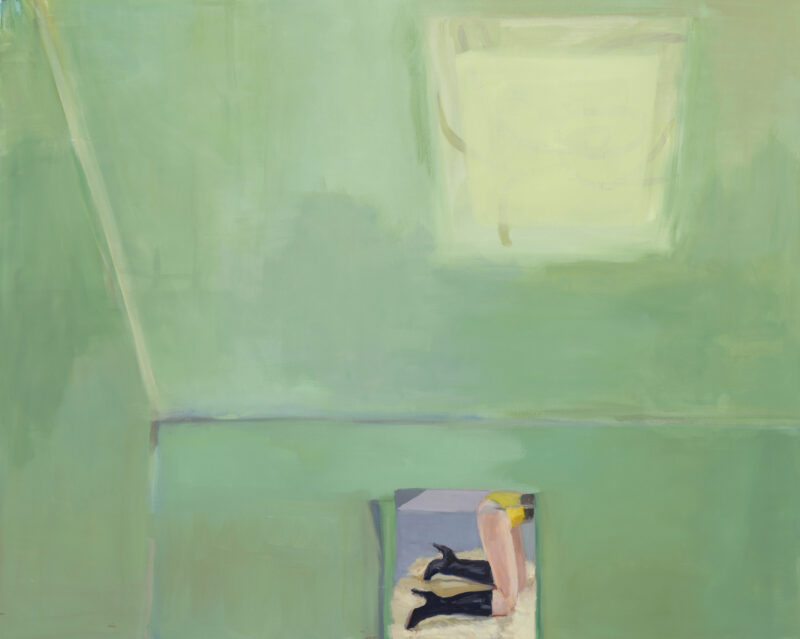 The first iteration occurs at Livart and includes thirteen artists working across various painting methods and styles. Here, the exhibition explores spatial contradictions, painting’s ability to represent actual physical spaces accurately, but also to imagine them differently, projecting into distant pasts and futures. Painting also allows the depiction of psychological or theoretical spaces to map metaphysical experiences on bi-dimensional planes. The space of Livart lends itself admirably to these experiments. The specter of this former presbytery remains discernible within the gallery as architectural elements have been preserved, such as wood moldings and fireplaces. Yet, the gallery, completely painted in white, feels bright, modern, fashionable, and almost futuristic. A string of rooms opens up to the large gallery, a vast room with two-story high ceilings accessed through a succession of mirror-covered doorways that make navigating the space feel like being inside a house of mirrors. In many ways, Livart is a playful space, and the selection of artists chosen for the exhibition emphasizes this. Many of them engage conceptually with the idea of play. In a number of works, there’s a slippage from painting into another medium, referencing other artistic practices such as collage, photography, sculpture, architecture, and even digital imaging, thereby testifying to painting’s unique proclivity for mimicry.