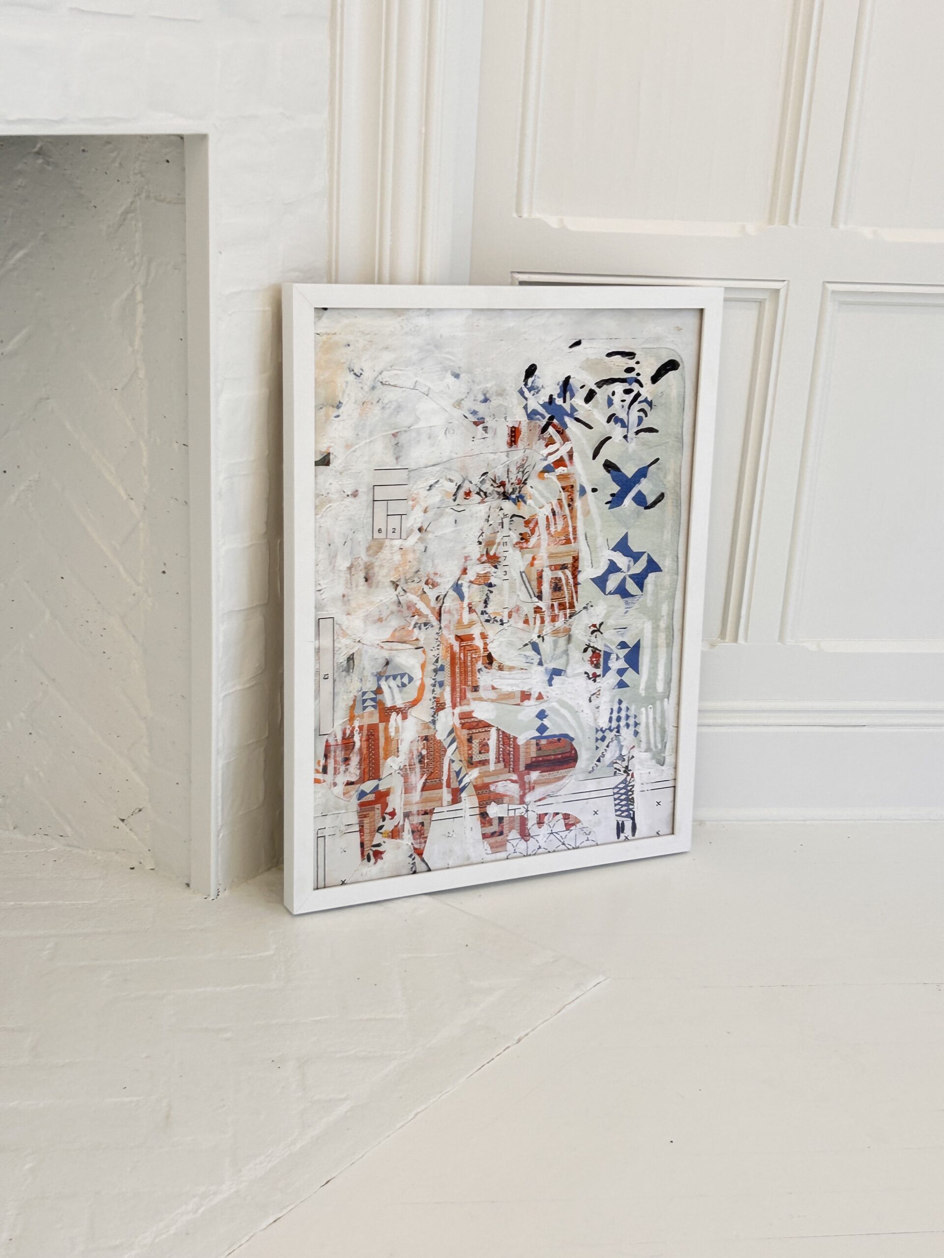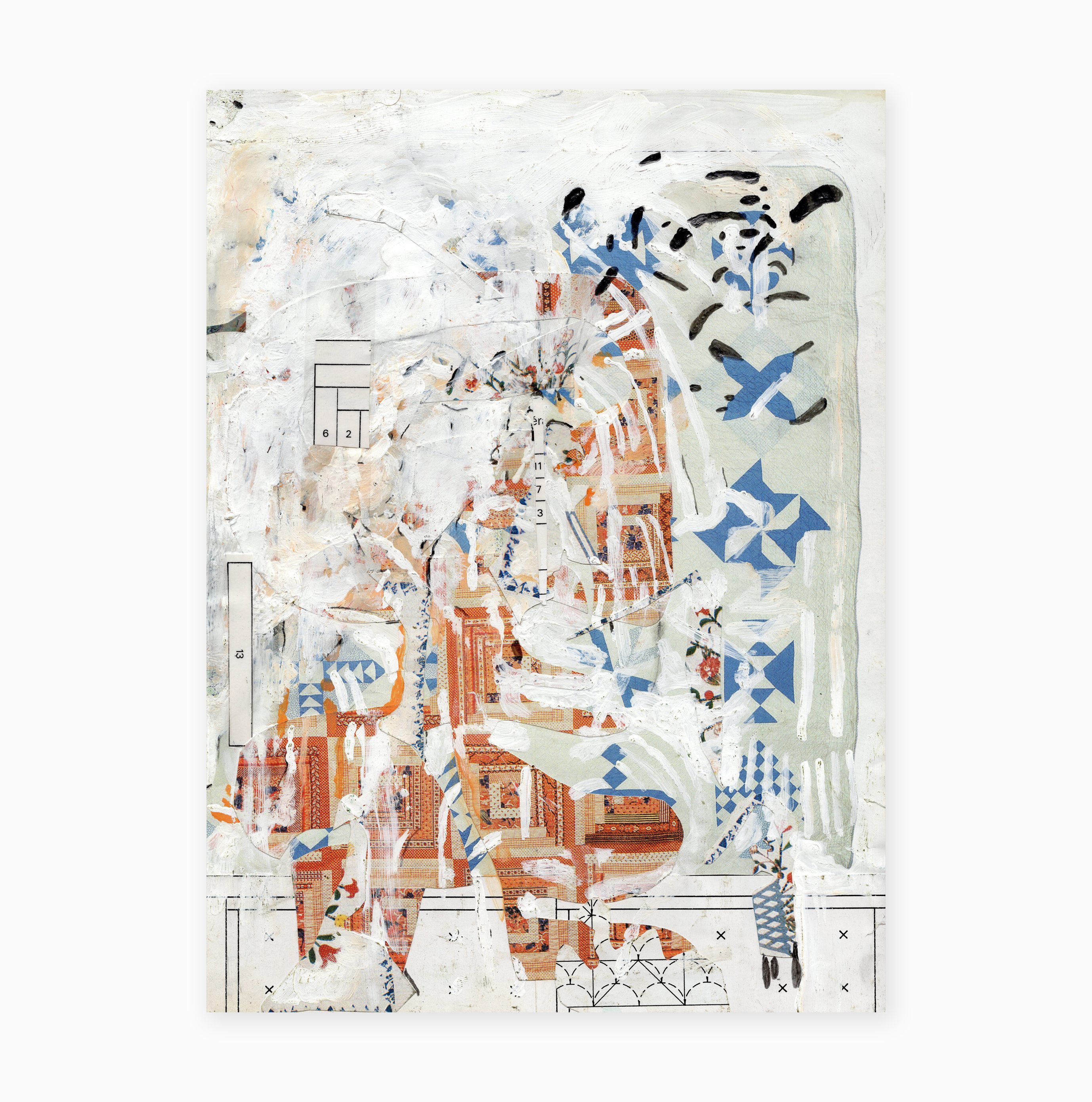 The image is created by digitization, the language specific to painting finds its way to image processing software. Various interactions of the artist, and the modified image is reprinted on a new physical medium. We then cut out this image to resonate the plastic qualities of an old recipe book that has taken on water, found in the attic. We re-intervene in painting on all the previous manipulations. The collage is torn to put its parts on other works in progress. Everything happens in Letter format, but is thought of in table format. When a work arises from this formal chaos, I scan it in high resolution to print it in large format on fine art paper.