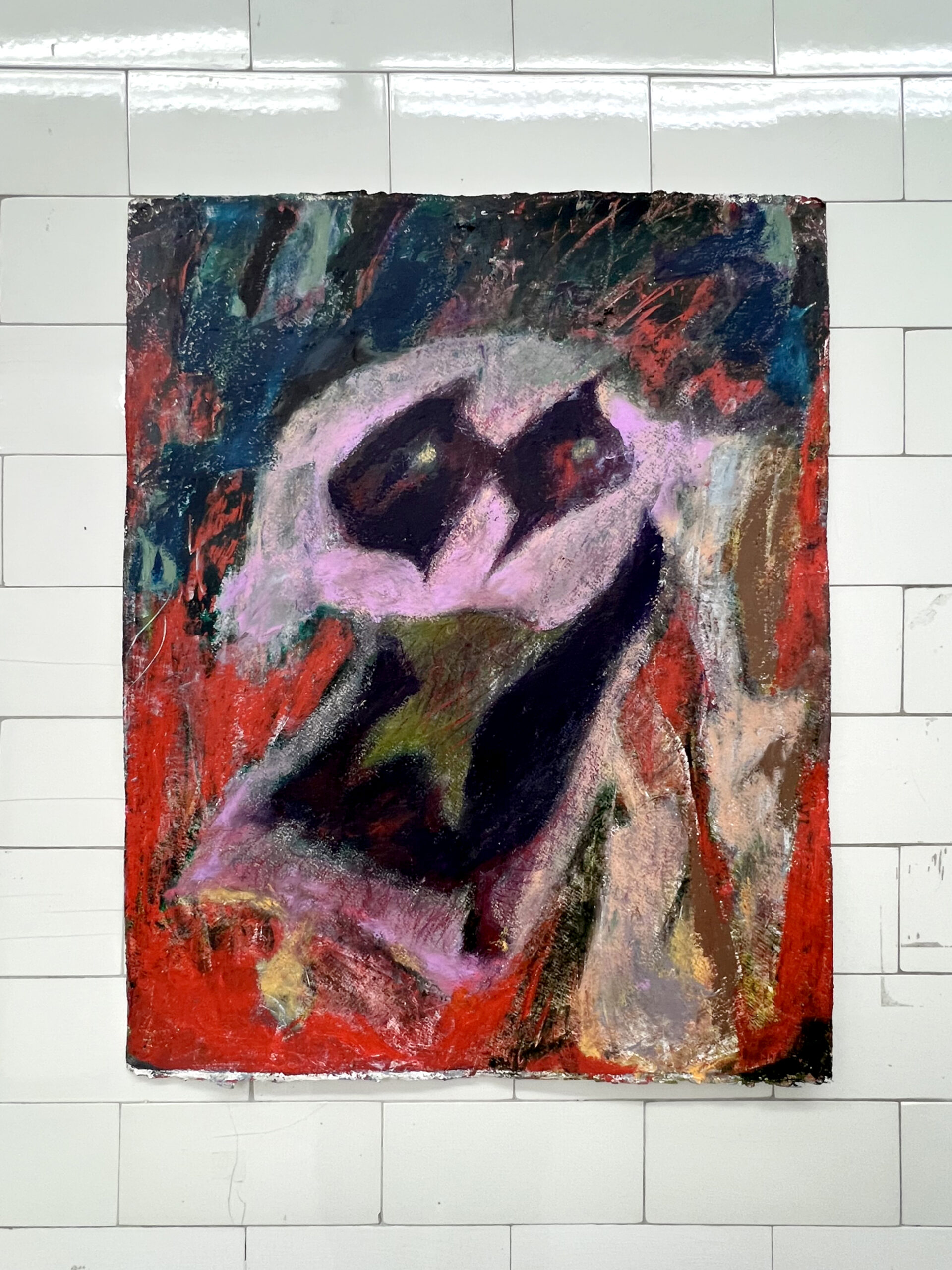 Although the characters verge on caricature, Bata still evokes sincerity through materiality. The artist embraces the notion of failure in the surfaces he works on. In the series Play Dead, he buries his ink-and-graphite-illustrated figures under thick, coarse layers of pastel, only to scrape away the material and unearth the figures again. It’s a continuous process of concealment and revelation, of inhalation and exhalation. Scratches and scrapes help shape the subjects as much as they conceal them.