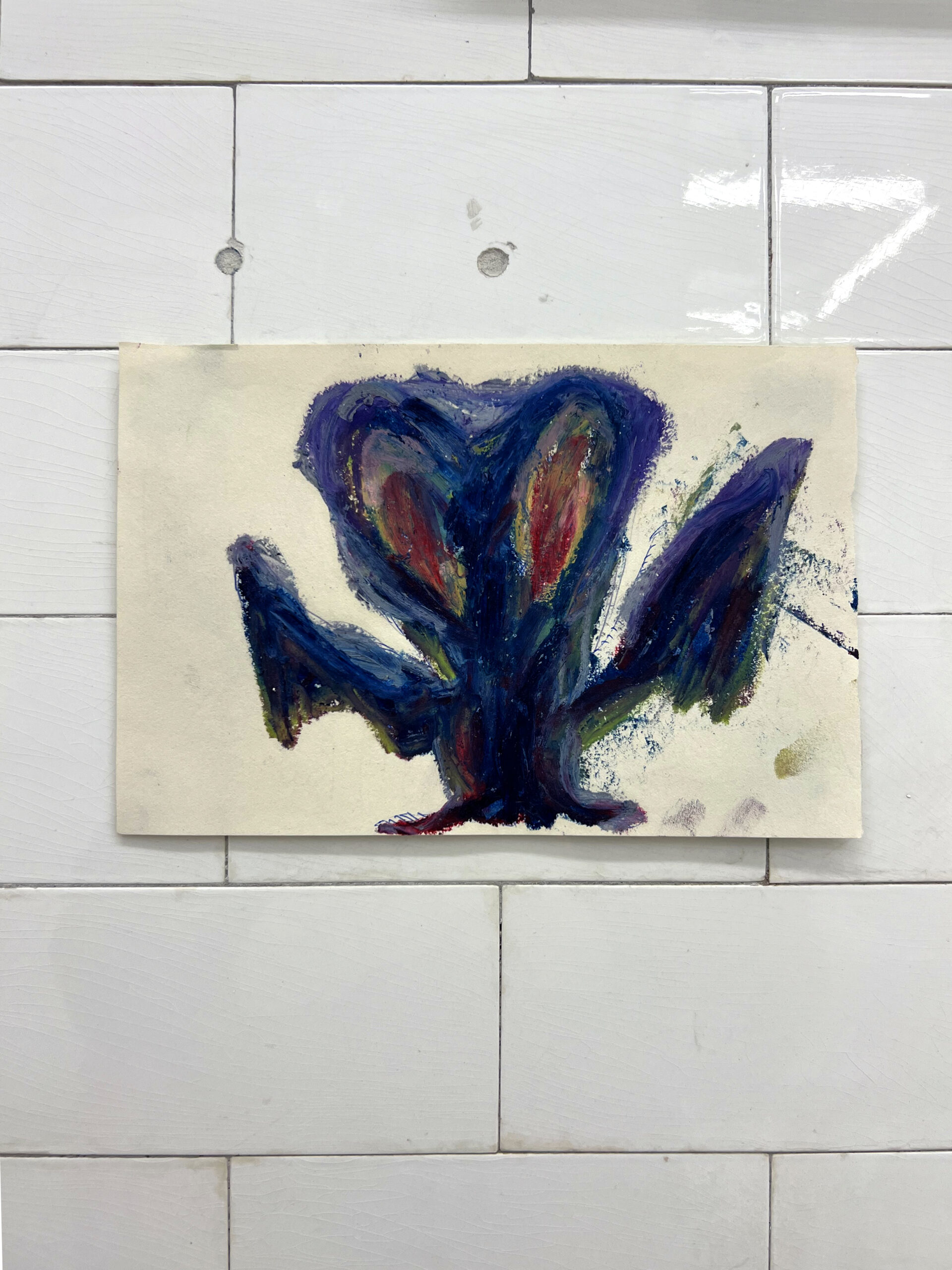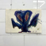 Although the characters verge on caricature, Bata still evokes sincerity through materiality. The artist embraces the notion of failure in the surfaces he works on. In the series Play Dead, he buries his ink-and-graphite-illustrated figures under thick, coarse layers of pastel, only to scrape away the material and unearth the figures again. It’s a continuous process of concealment and revelation, of inhalation and exhalation. Scratches and scrapes help shape the subjects as much as they conceal them.