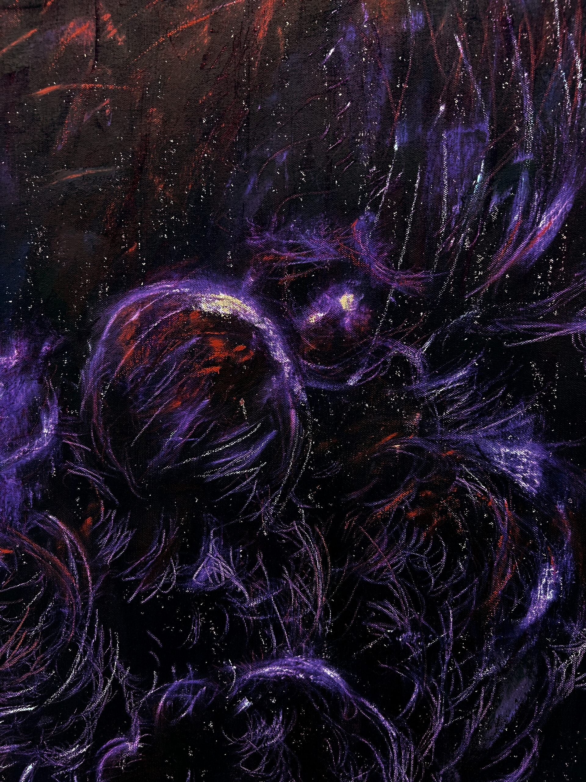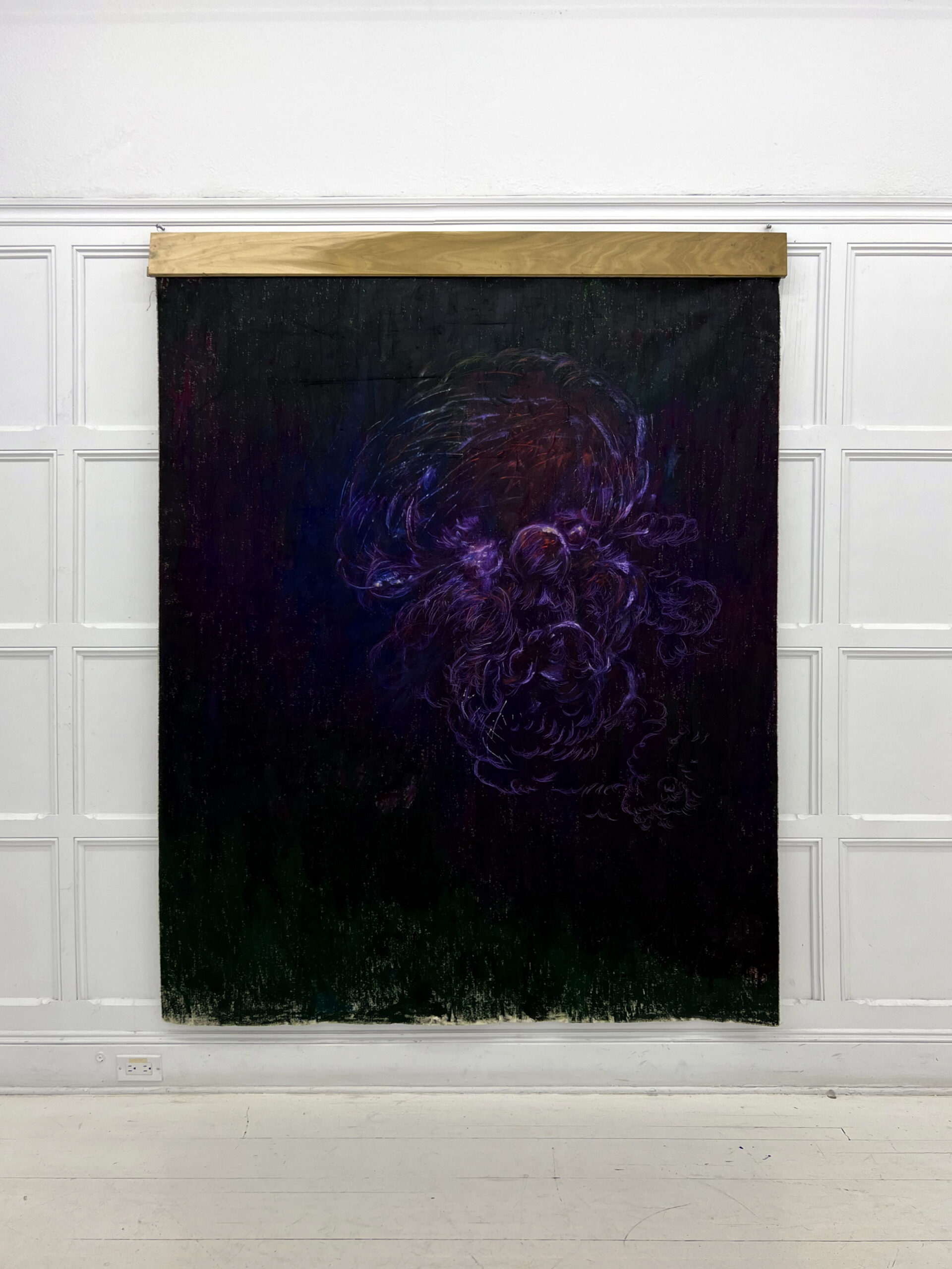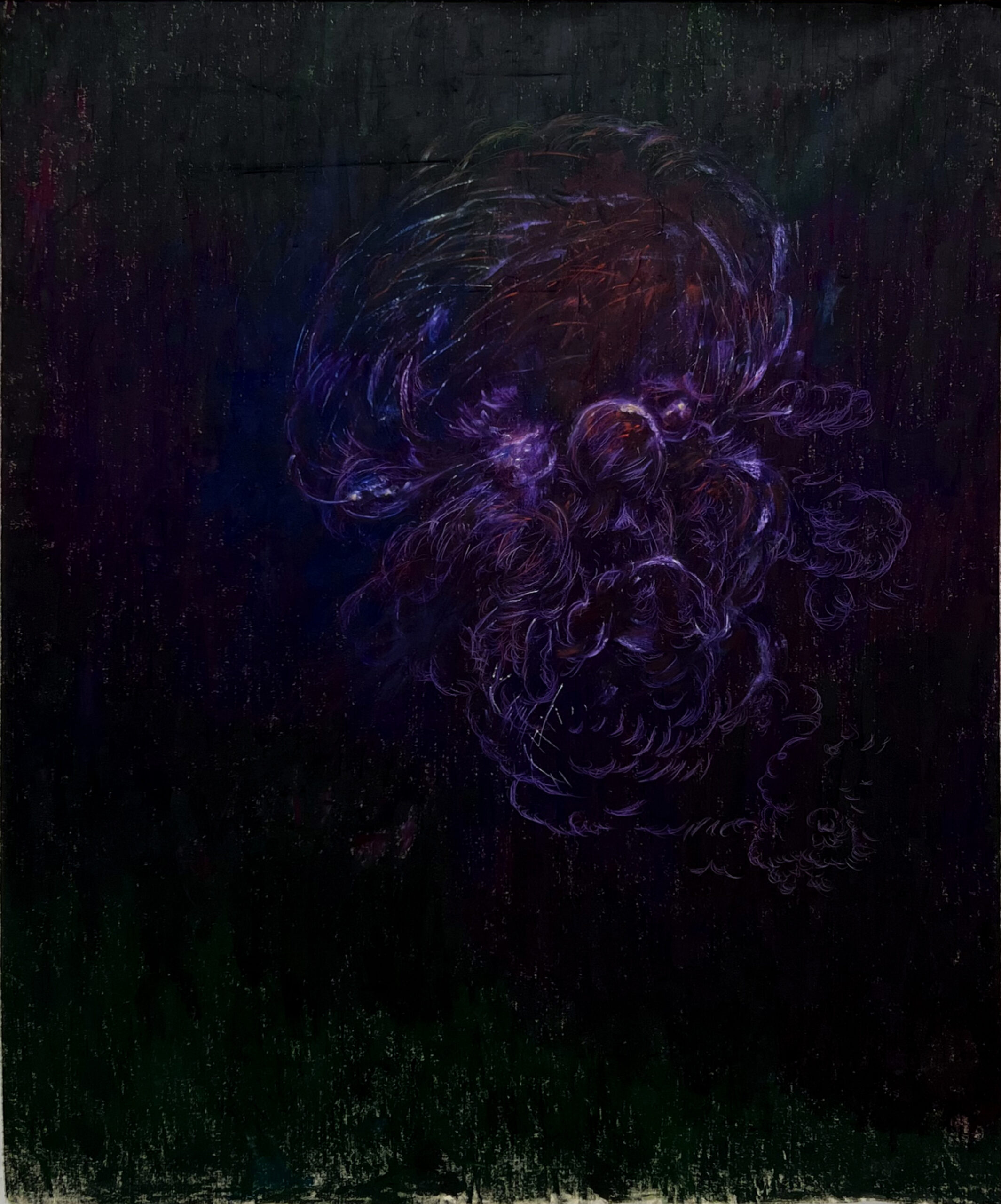 Although the characters verge on caricature, Bata still evokes sincerity through materiality. The artist embraces the notion of failure in the surfaces he works on. In the series Play Dead, he buries his ink-and-graphite-illustrated figures under thick, coarse layers of pastel, only to scrape away the material and unearth the figures again. It’s a continuous process of concealment and revelation, of inhalation and exhalation. Scratches and scrapes help shape the subjects as much as they conceal them.