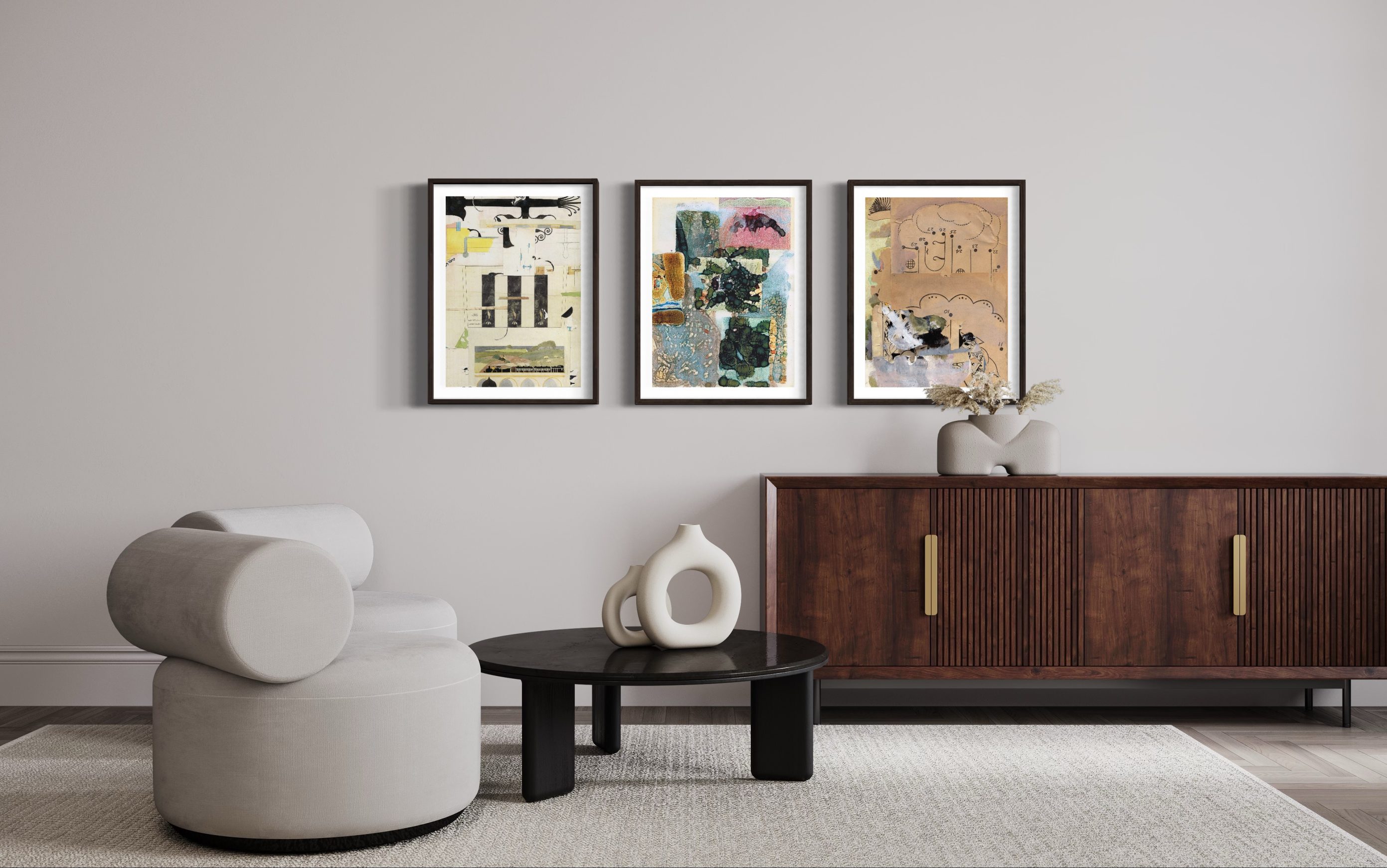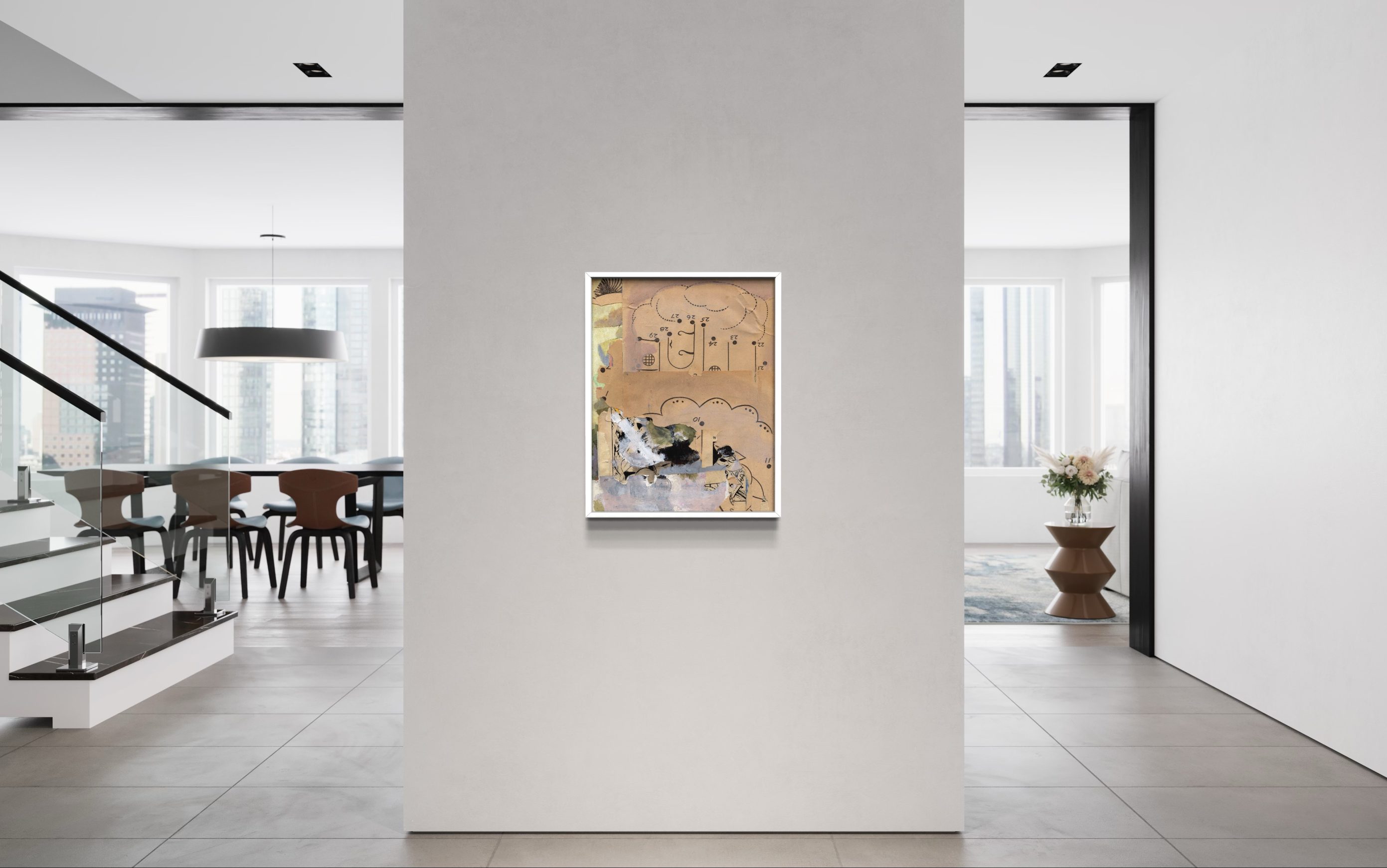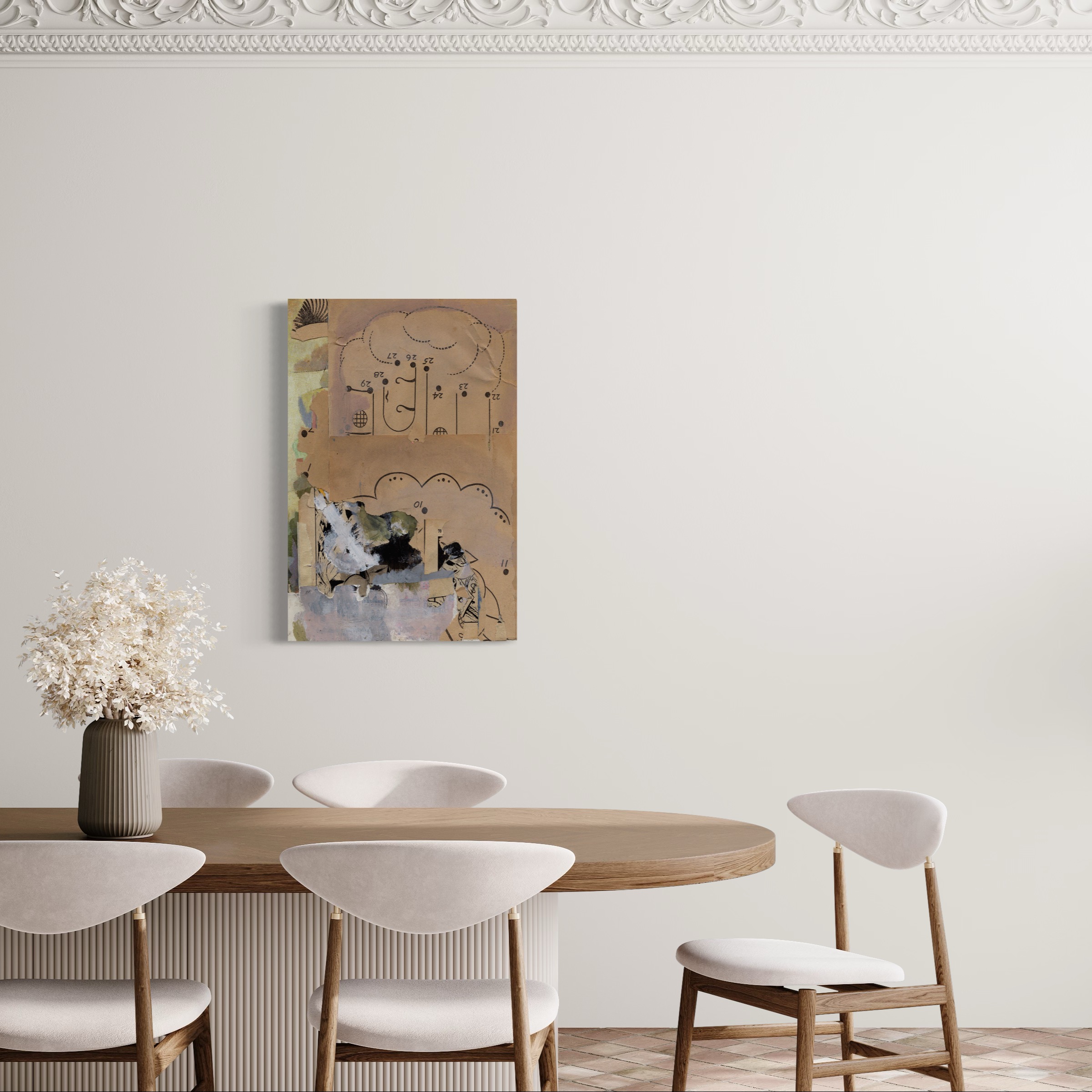 The image is created by digitization, the language specific to painting finds its way to image processing software. Various interactions of the artist, and the modified image is reprinted on a new physical medium. We then cut out this image to resonate the plastic qualities of an old recipe book that has taken on water, found in the attic. We re-intervene in painting on all the previous manipulations. The collage is torn to put its parts on other works in progress. Everything happens in Letter format, but is thought of in table format. When a work arises from this formal chaos, I scan it in high resolution to print it in large format on fine art paper.