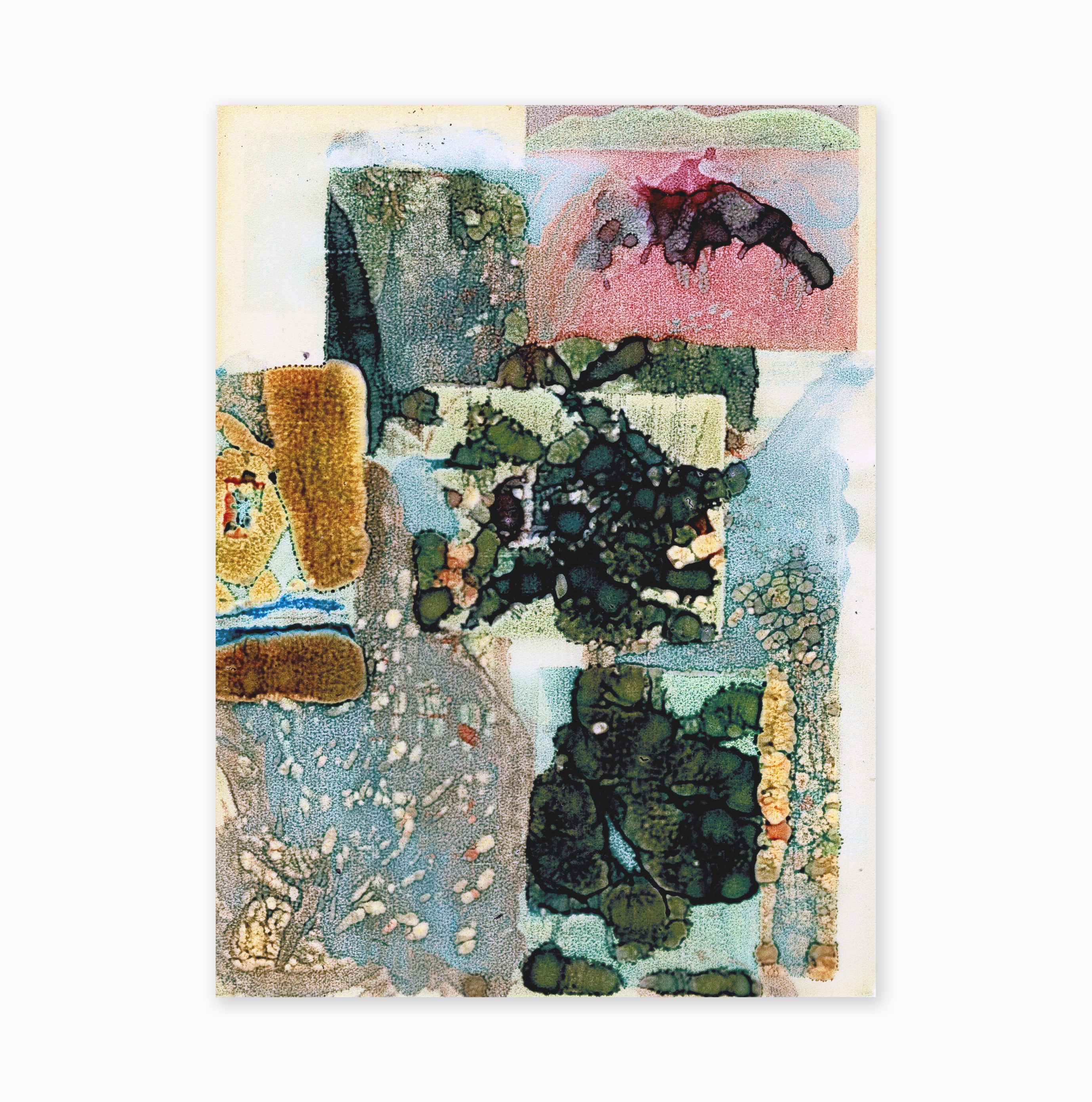 The image is created by digitization, the language specific to painting finds its way to image processing software. Various interactions of the artist, and the modified image is reprinted on a new physical medium. We then cut out this image to resonate the plastic qualities of an old recipe book that has taken on water, found in the attic. We re-intervene in painting on all the previous manipulations. The collage is torn to put its parts on other works in progress. Everything happens in Letter format, but is thought of in table format. When a work arises from this formal chaos, I scan it in high resolution to print it in large format on fine art paper.