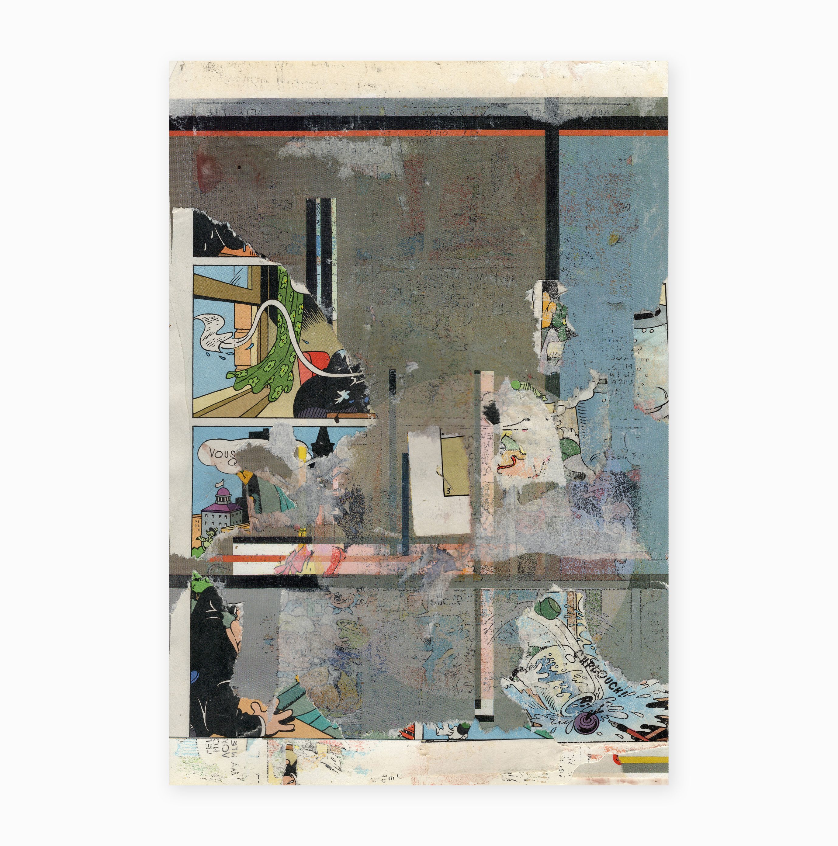 The image is created by digitization, the language specific to painting finds its way to image processing software. Various interactions of the artist, and the modified image is reprinted on a new physical medium. We then cut out this image to resonate the plastic qualities of an old recipe book that has taken on water, found in the attic. We re-intervene in painting on all the previous manipulations. The collage is torn to put its parts on other works in progress. Everything happens in Letter format, but is thought of in table format. When a work arises from this formal chaos, I scan it in high resolution to print it in large format on fine art paper.