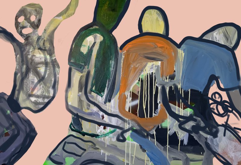 Les figures représentées dans les œuvres d’OSKI (Olivier Vilaire) évoquent des silhouettes fantomatiques qui déambulent dans des espaces dont les couleurs sont à la fois pâles et vives – qui expriment un ton aussi festif qu’inquiétant. D’autres de ses peintures, plus abstraites, dégagent une tension similaire qui semble annoncer une précipitation vers un éclatement et potentiellement vers un relâchement délirant.