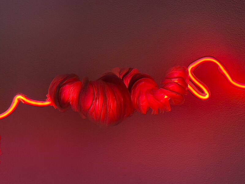 Associants des matériaux fragiles comme le néon et le papier mâché avec des éléments que l’on considère acquis de notre quotidien tel que l’électricité et la lumière, l’artiste met en scène des petites créatures aux allures mystérieuses, possédants des aptitudes empathiques, tout droit sortis d’un imaginaire suggérant une nouvelle vie, qui commence à l’intersection entre l’œuvre et l’objet.