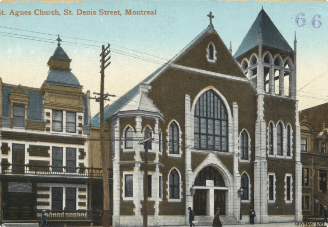 La première véritable occupation des lots occupés par le Sanctuaire Saint-Jude, aussi connu sous le nom de Sanctuaire du Rosaire, est celle de la paroisse catholique anglophone de Saint-Agnès (Magnan, 1952). Érigée en 1905, sa création remonte au 10 août 1903 lorsqu’une pétition réclamant une nouvelle paroisse d’expression anglophone par les paroissiens de Saint-Jean-Baptiste fût déposée à Mgr. Paul Bruchesi, l’archevêque de Montréal. Celui-ci exauça le vœu des fidèles, l’année suivante, en officialisant le projet le 21 avril 1904 dans le journal La Gazette. Le site, au limite des quartiers St-Louis et du village de Saint-Jean-Baptiste, est alors choisi et approuvé le 25 juin 1904 par Mgr. Bruchesi.