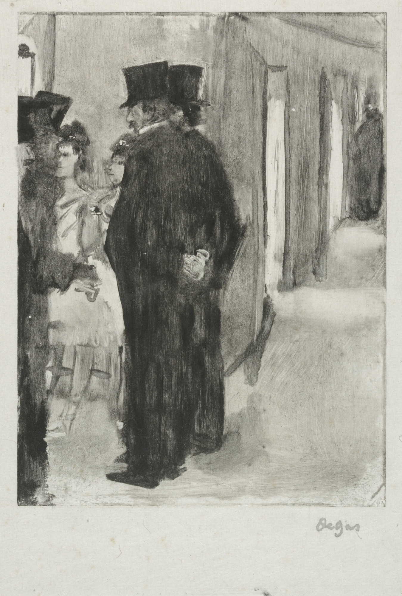 À droite : Pauline et Virginie Cardinal bavardant avec des admirateurs – Edgar Degas (1876–1877)