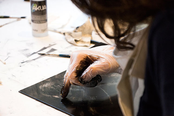 L’estampe correspond généralement à une forme d’impression précédée par un minutieux travail de gravure, mais on oublie souvent que cette pratique ne s’y limite pas. Le monotype permet de retrouver ce processus créatif sans avoir à ciseler ni entailler quoi que ce soit. Il s’agit d’un tirage unique, obtenu par la pression du papier contre une plaque lisse (métal, plastique, verre…). De l’encre ou de la peinture peuvent être utilisées comme médium, et la création de l’oeuvre peut suivre deux processus : une pression manuelle ou mécanique sur le papier comprenant le motif (on parlera d’addition), ou le retrait du médium créant le motif par soustraction, sur une plaque entièrement recouverte.