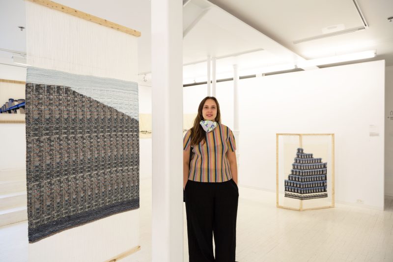 L’expression « tissu urbain » colle à la peau de l’artiste et tisserande Sophia Borowska. Le bâti dans une ville est composé de lignes et de barres majoritairement horizontales et verticales. C’est ce que l’on retrouve dans sa pratique du métier à tisser. Mais pas seulement. En amalgamant des matériaux de construction comme le bois, le ciment et l’acier à des matières textiles propres à son médium de prédilection, elle se joue des contradictions avec une prise de position féministe.