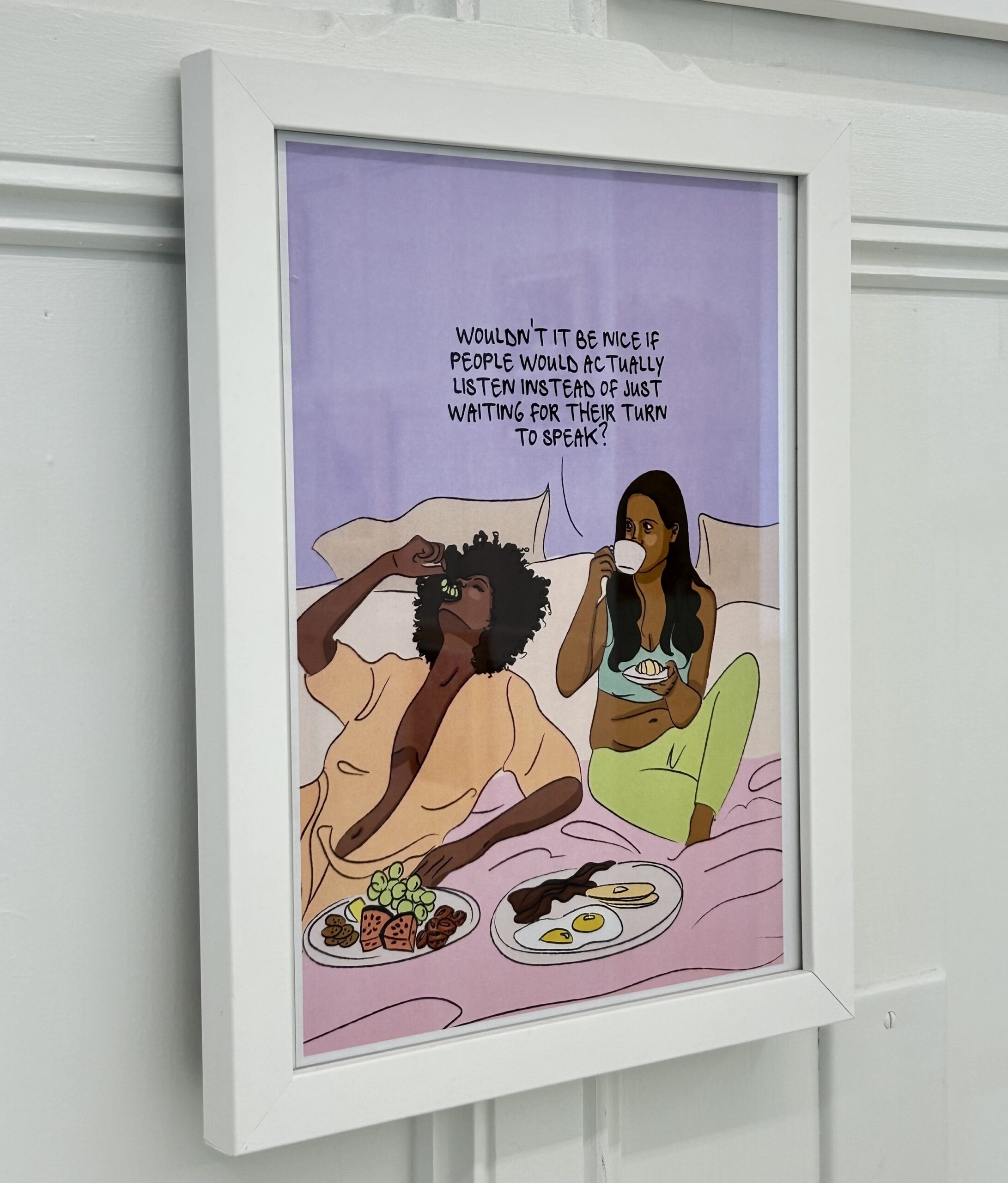 Niti Marcelle Mueth est une artiste multidisciplinaire et directrice artistique indépendante, basée à Montréal. Évoluant de manière fluide entre l’art et les pratiques orientées vers le design, Niti s’investit dans la narration visuelle s’articulant autour de la réflexion des expériences d’individus issus des communautés PANDC. Elle explore une variété de médiums tels que l’illustration, le design graphique et de mode, la sérigraphie, la couture ainsi que l’animation.