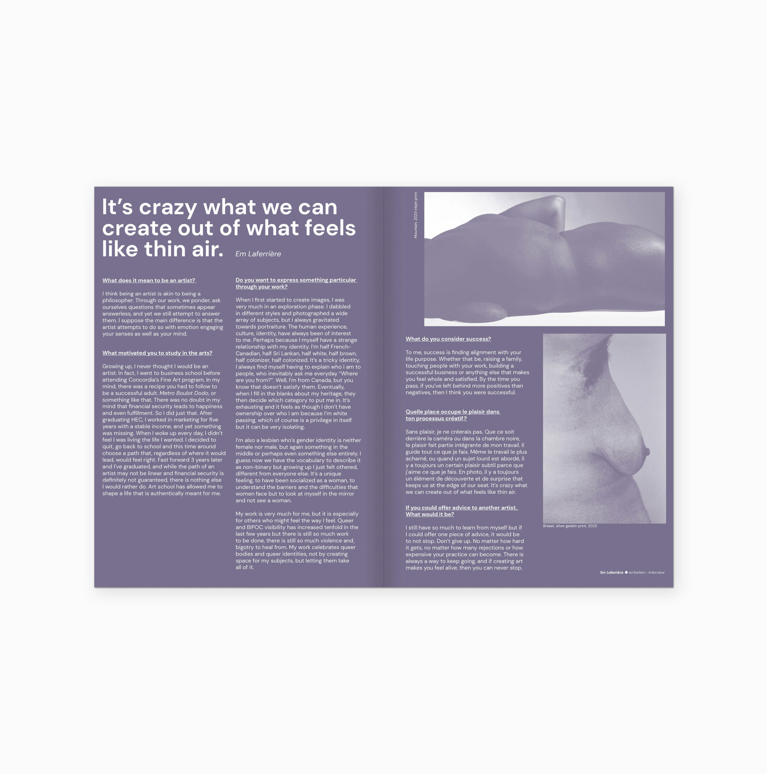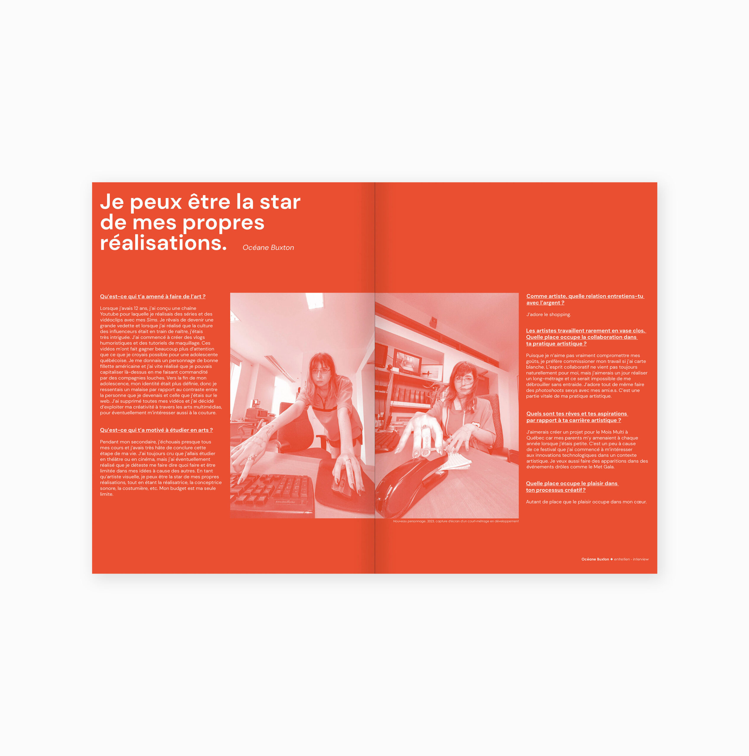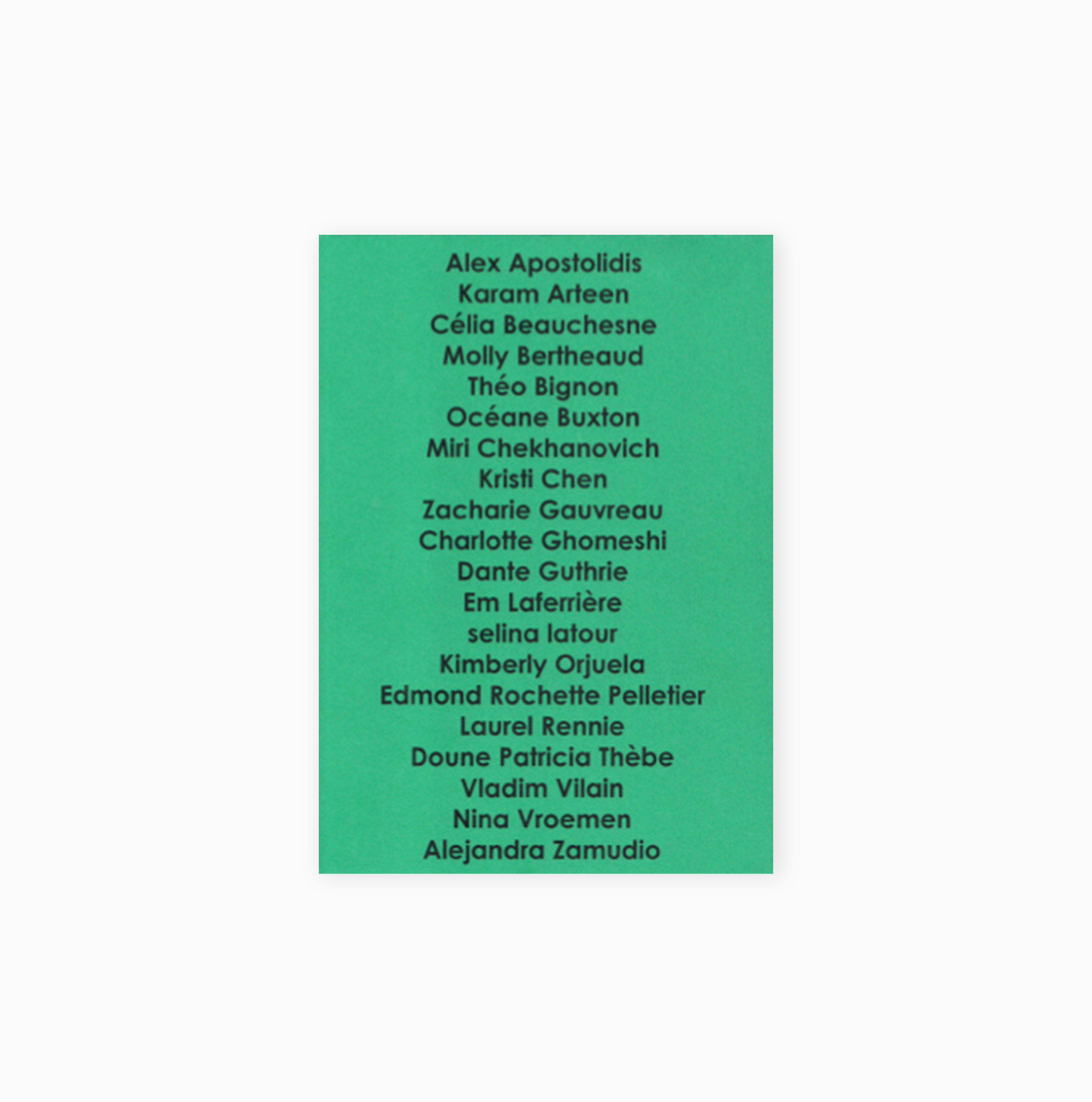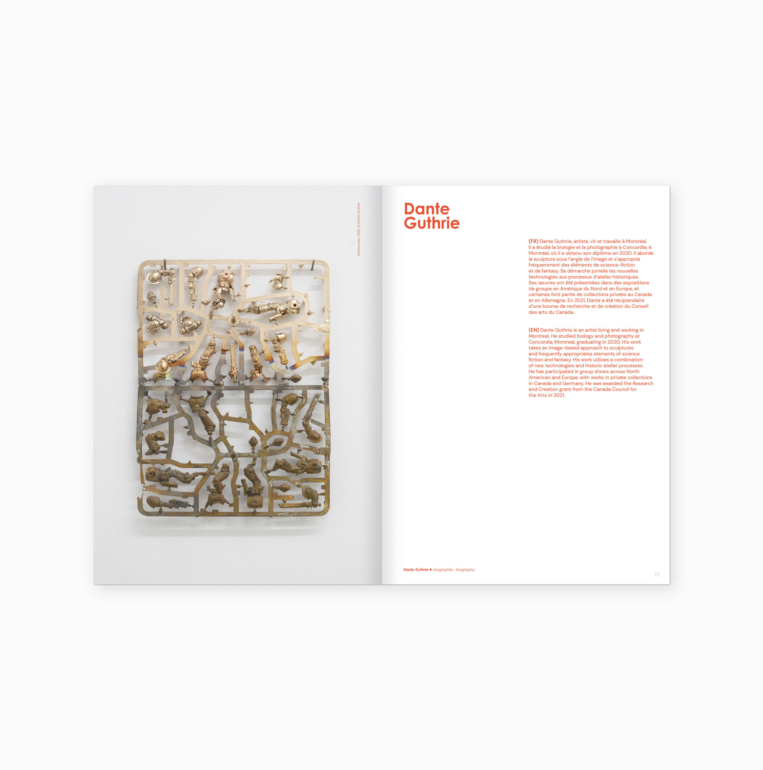 En plus de présenter les œuvres des 20 artistes participant·e·s au festival en images, cette édition met en lumière la singularité de leurs expériences à travers une série d’entretiens réalisés en collaboration avec Pièce jointe. À travers ces échanges, les artistes partagent leurs espoirs, leurs craintes et leurs aspirations sur la création, les études, le milieu artistique et leurs communautés d’appartenance. Ce catalogue offre une immersion unique dans les trajectoires personnelles et professionnelles, aussi exaltantes que périlleuses, de ceux et celles qui forment la relève en art actuel.