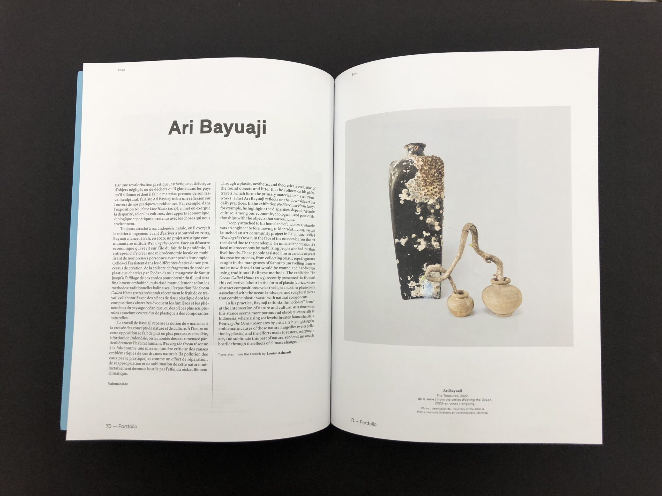 Chaque numéro propose un dossier thématique complété par un portfolio d’œuvres, une section d’articles critiques, des chroniques, des comptes rendus d’expositions ou d’événements et une section présentant les activités de ses partenaires publicitaires