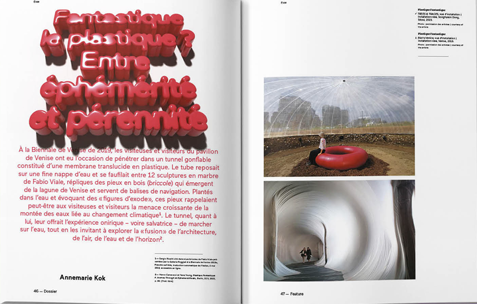 L’analyse du plastique dans le champ de l’art soulève de nombreux dilemmes environnementaux. Loin de faire l’éloge du plastique, mais sans pour autant en nier l’utilité, ce dossier s’intéresse à nos manières de cohabiter avec la matière synthétique, tantôt pour en évaluer les conséquences et participer à la recherche de solutions de rechange, tantôt pour revendiquer une parenté avec ce qui a fait la gloire du matériau : sa plasticité, laquelle exprime à la fois le pouvoir de recevoir et de donner la forme.