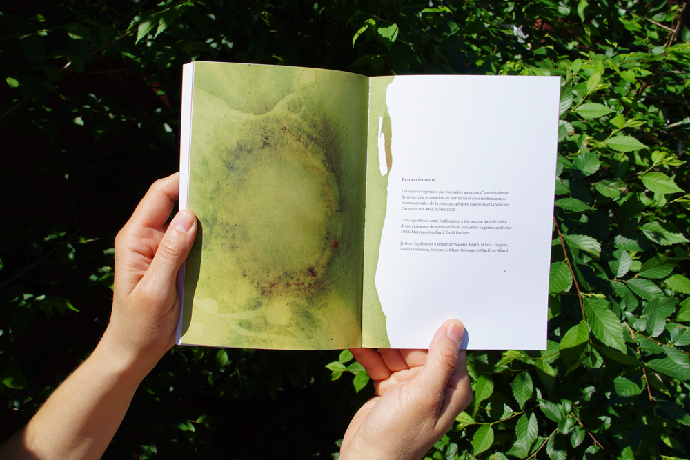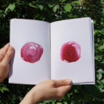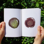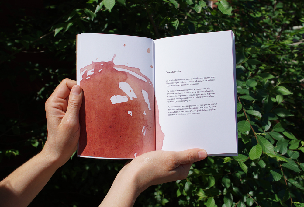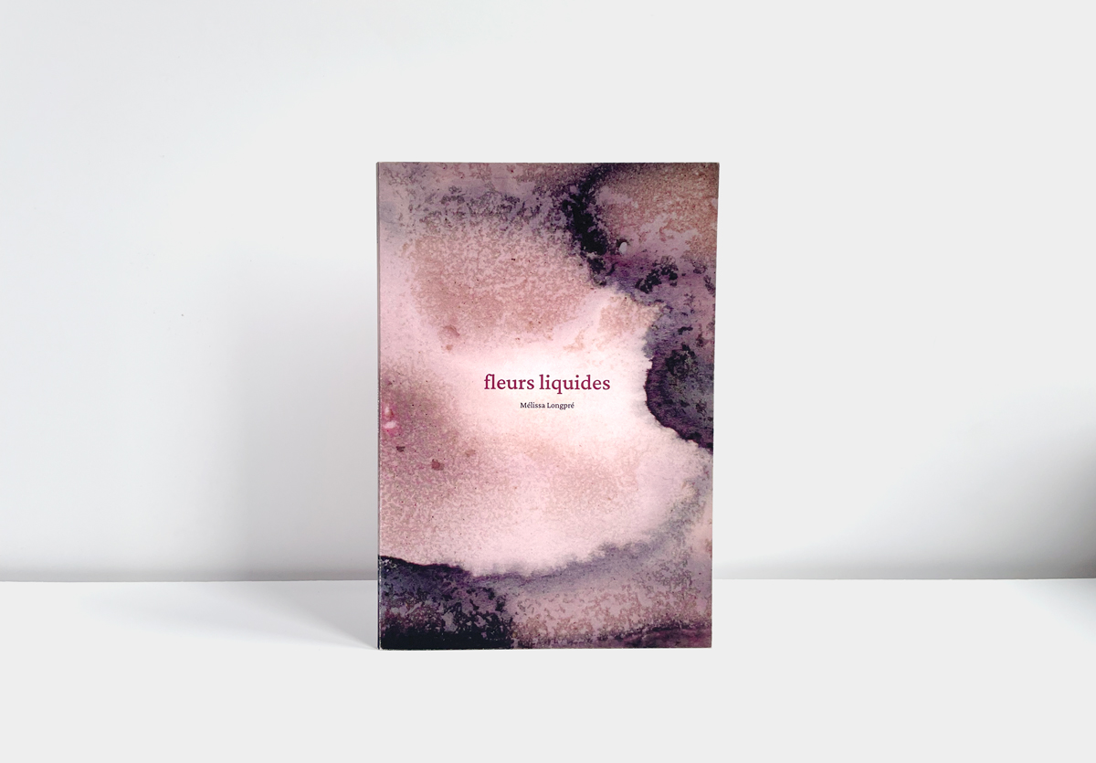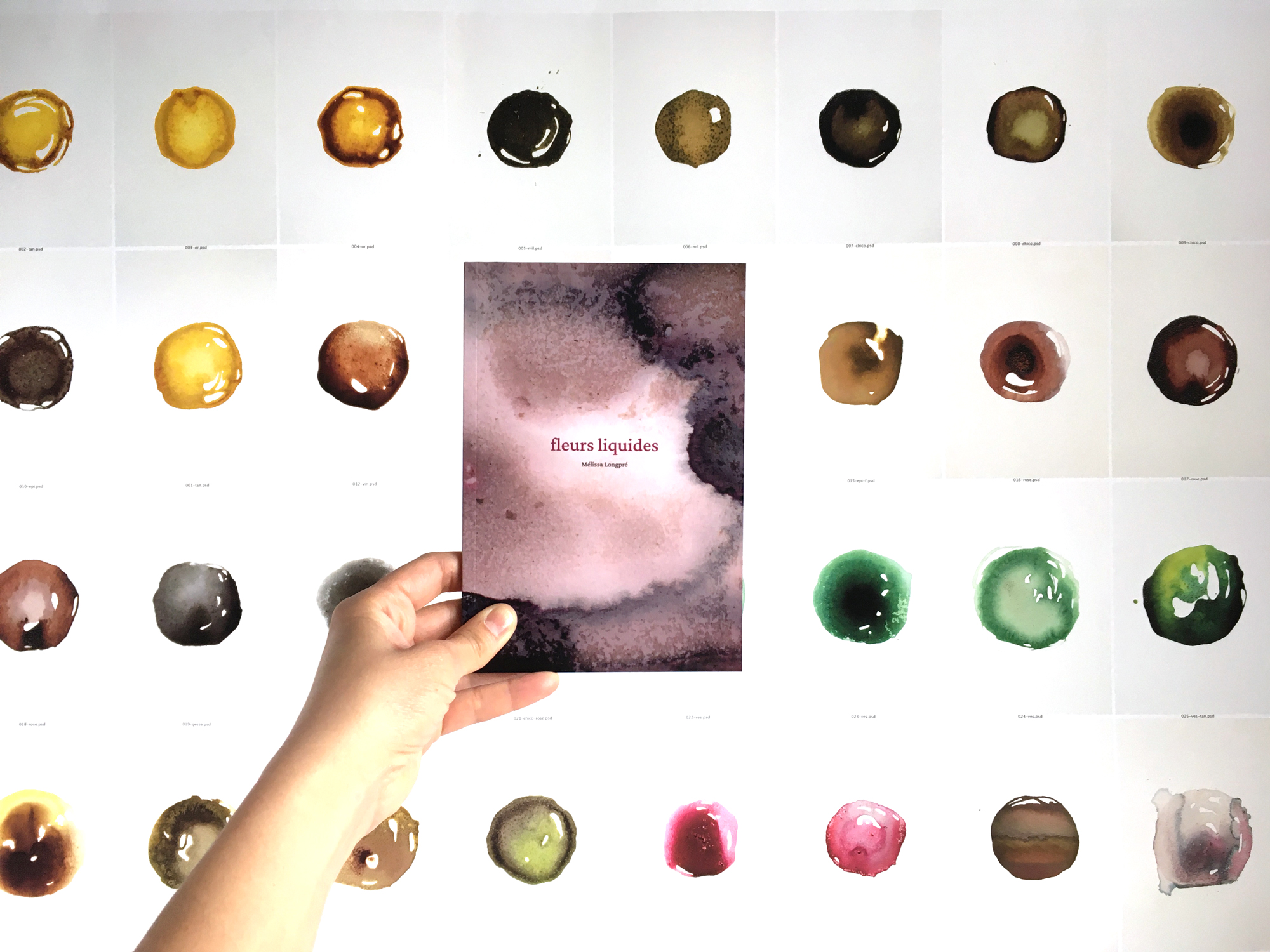 fleurs liquides, est un livre photographique qui regroupe des images de ronds d’encres végétales. Indigènes ou introduites, les variétés les plus abondantes de fleurs sauvages façonnent le paysage. Pour créer les encres, Mélissa a entre autres cueilli des roses sauvages, des épilobes, de la verge d’or et du millepertuis dans la Baie-des-Chaleurs, en Gaspésie. Elle a ensuite expérimenté avec celles-ci sans souci de conservation, laissant la matière se transformer. Déposées au compte-gouttes sur du papier aquarelle, les encres ont séché laissant apparaître leur propre géographie.