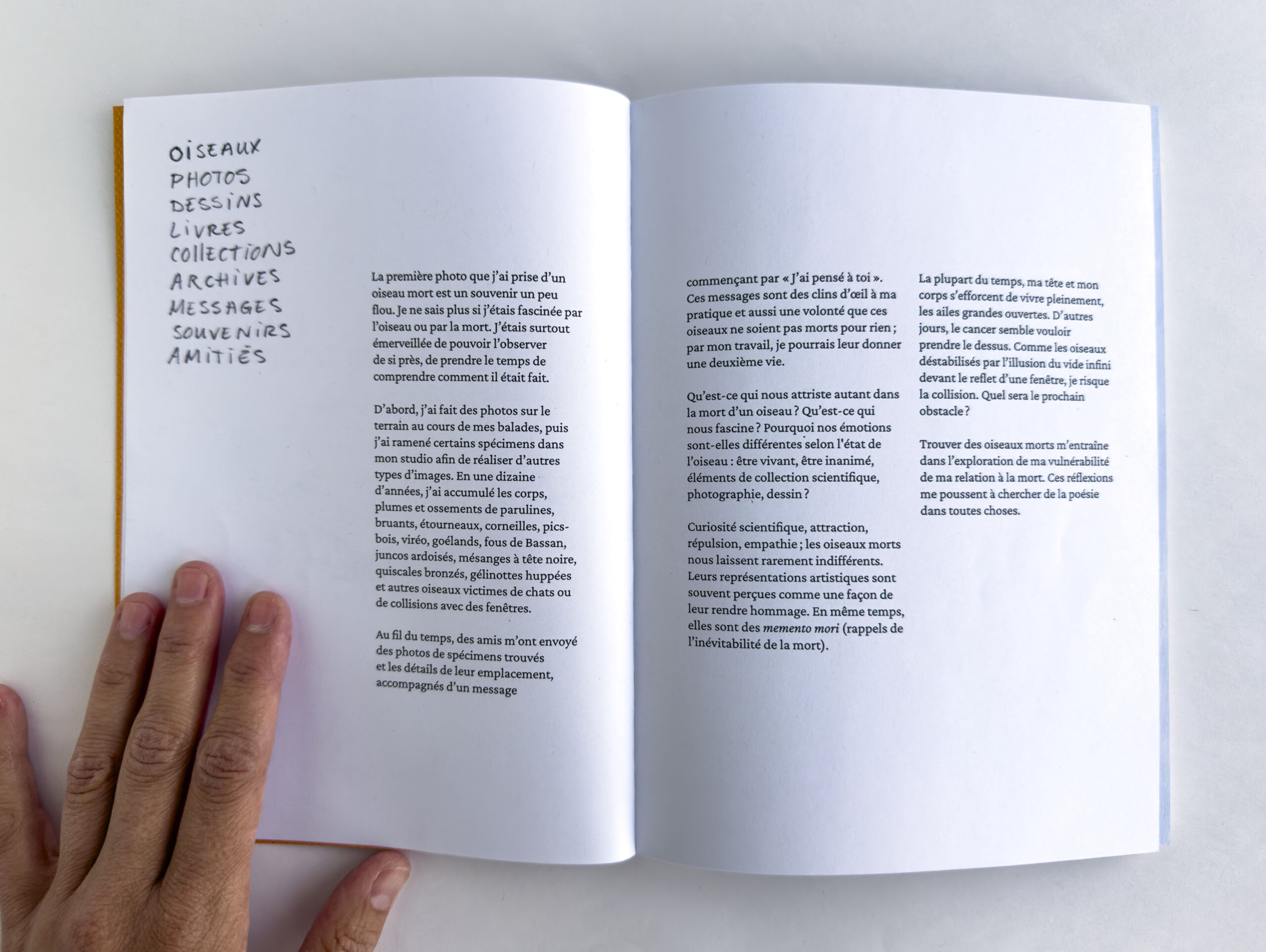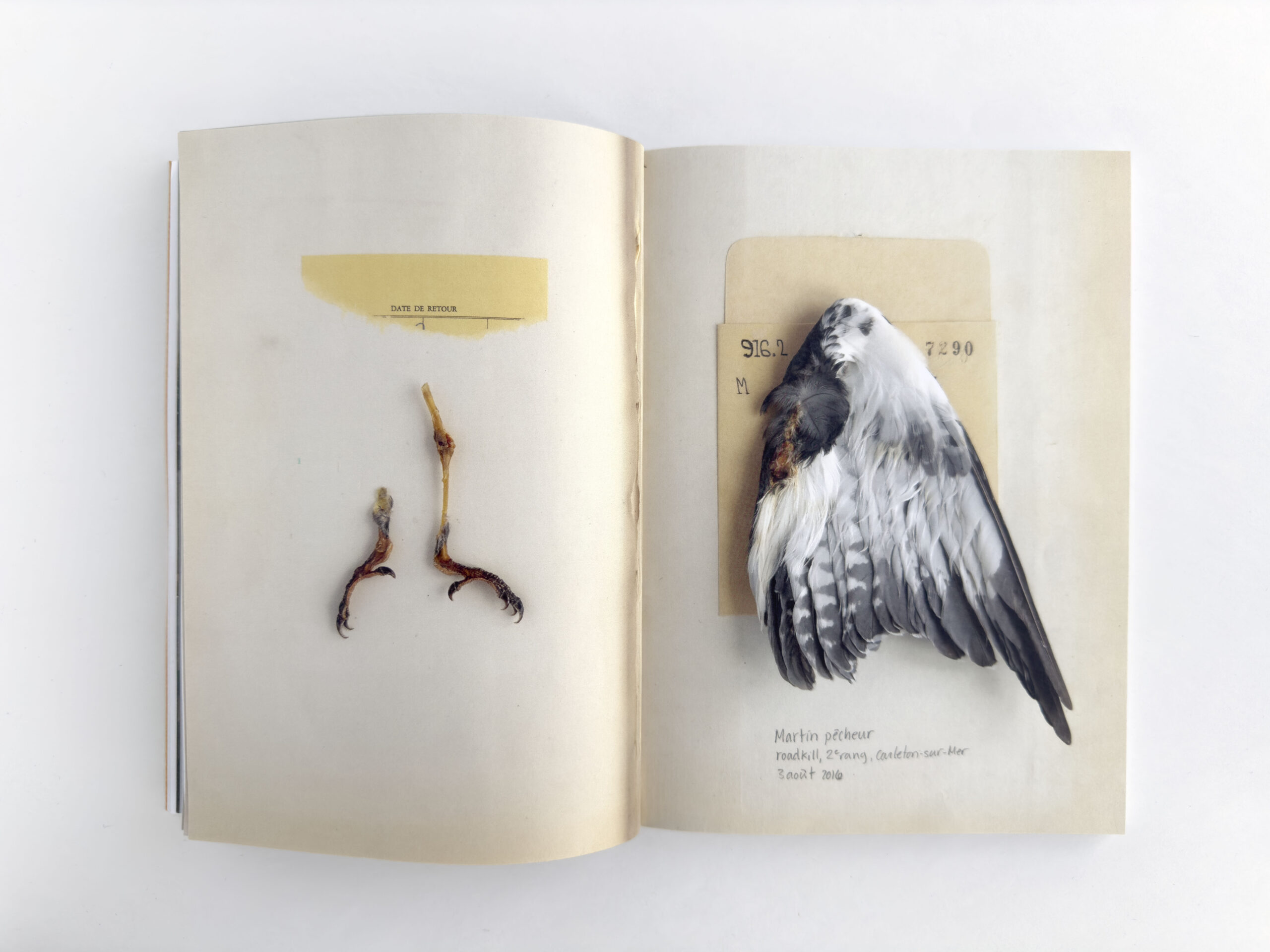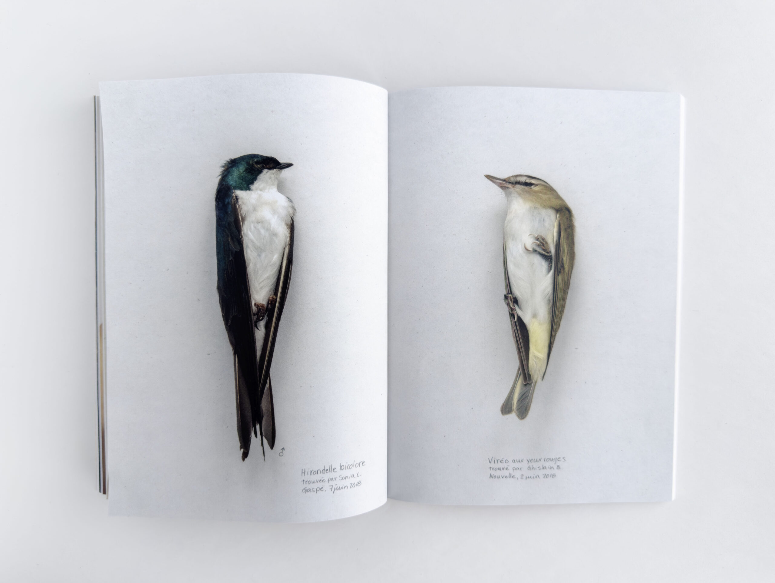 C’est au cours des dix dernières années que Mélissa Longpré a recueilli les corps, plumes et petits ossements de parulines, bruants, étourneaux et autres oiseaux victimes de prédateurs naturels ou de collisions avec des fenêtres. Au hasard de ces événements, des amis de l’artiste la contactent avec des photos de spécimens trouvés et des détails de leur emplacement, accompagnés d’une note : «J’ai pensé à toi». Signe que la mortalité des oiseaux laisse rarement indifférent, l’artiste voit aussi en eux une forme de memento mori, un rappel de l’inévitabilité de nos propres morts. Elle aborde ainsi leur représentation comme une occasion de leur rendre hommage et de proposer une réflexion sur leur statut, entre être animé et inanimé, spécimen de collection et photographie.