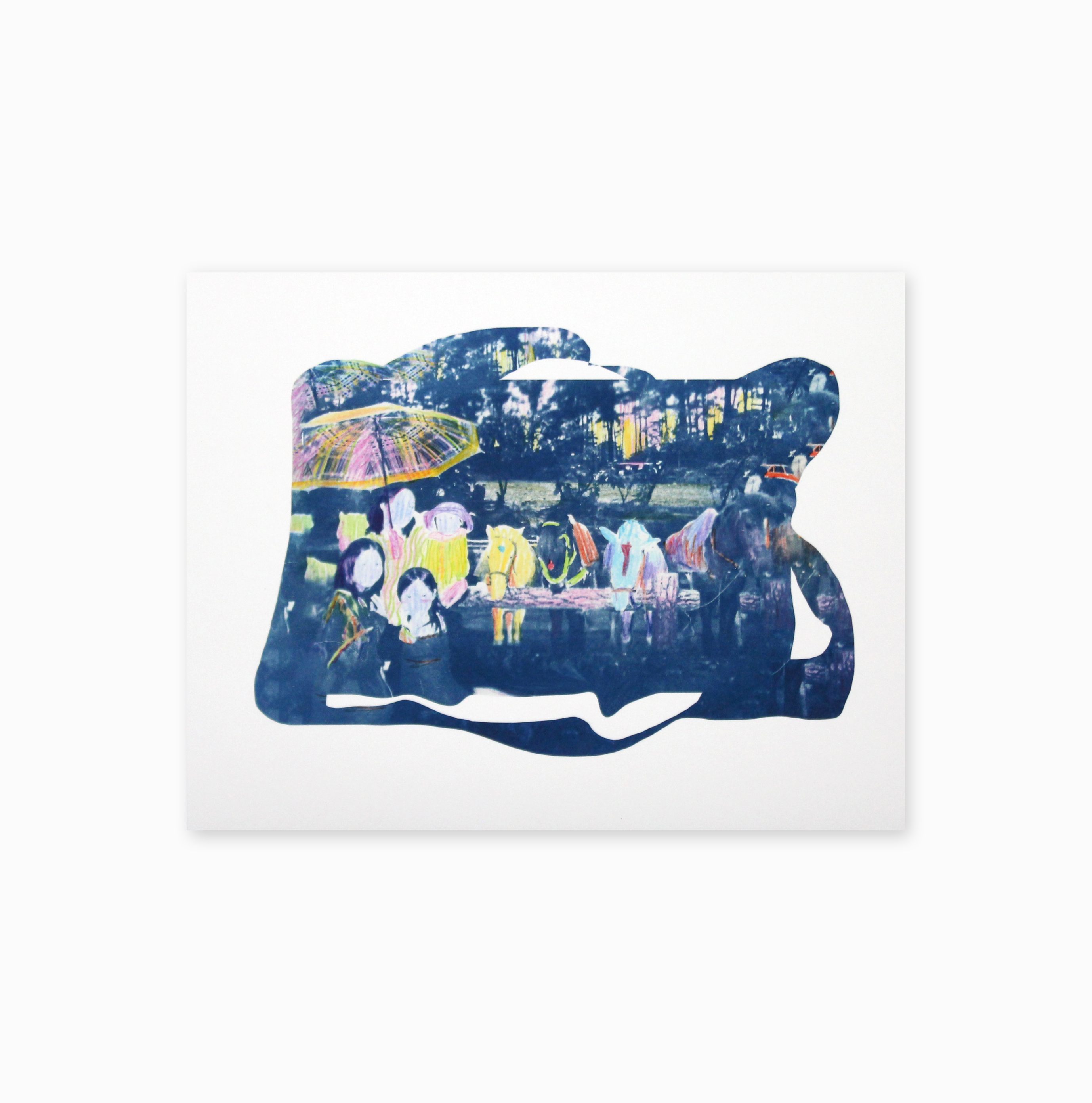 “Dito sa San Jacinto, Doon sa Santo Tomas” est une série d’impression de cyanotype provenant de photos 35mm que la mère de l’artiste a pris entre fin 1980 et début 2000. Ce sont des moment de la jeunesse de l’artiste à différents stage de sa jeunesse où elle a grandit – San Jancito et Santo Tomas. Les souvenirs un peu flou, Dela Peña tente de faire revivre ses moments en offrant une différente narration et perception que celle de sa mère (qui a pris les photos) avec l’impression cyanotype. Les espaces blancs des images sont coloré au crayon de bois, ce qui métamorphose la banalité de l’image pour en faire un cliché contemporain et animé par la couleur.