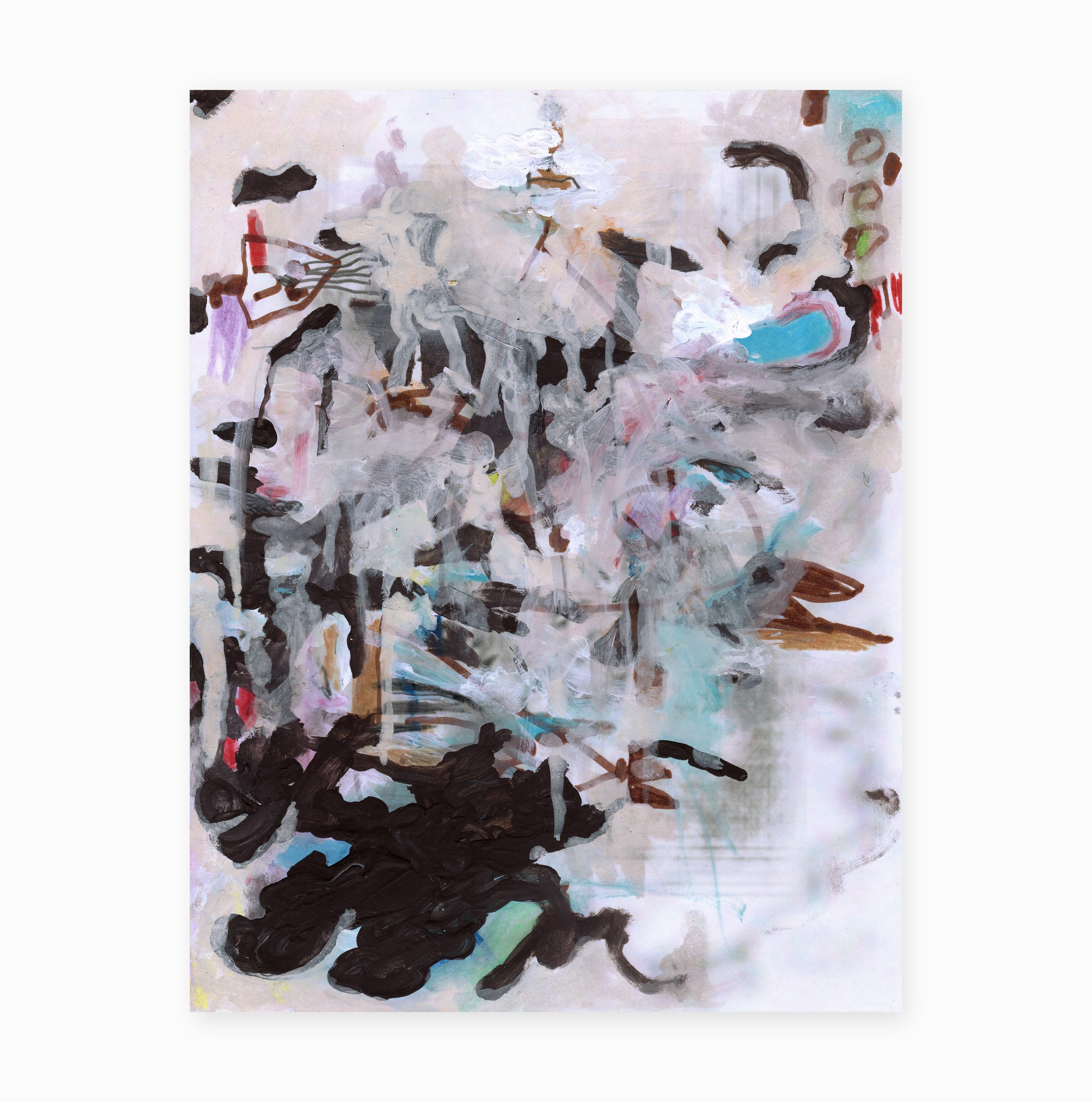 L’image est créé par la numérisation, le langage propre à la peinture trouve son chemin vers un logiciel de traitement de l’image. Diverses interactions de l’artiste, et on réimprime l’image modifiée sur un nouveau support physique. On vient ensuite découper cette image pour faire résonner les qualités plastiques d’un vieux livre de recette qui a pris l’eau, trouvé au grenier. On ré-intervient en peinture sur toutes les manipulations précédentes. On déchire le collage pour poser ses parties sur d’autres travaux en cours. Le tout se passe en format Lettre, mais se pense en format tableau. Lorsqu’une œuvre naît de ce chaos formel, je la numérise en haute résolution pour l’imprimer en grand format sur papier fine art.